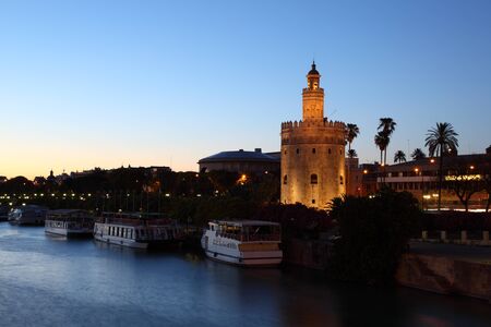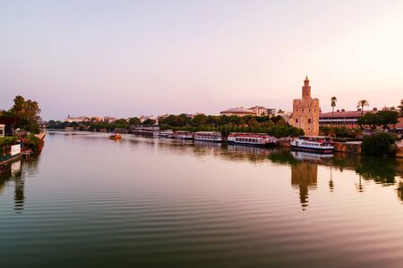 Beautiful tower of gold and Guadalquivir river at sunset in Seville, Spain