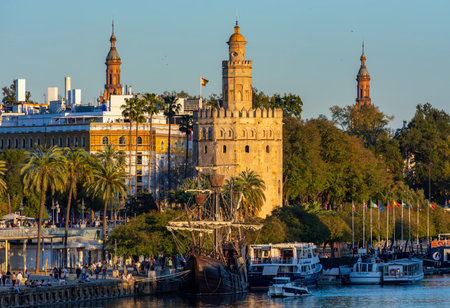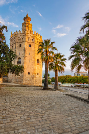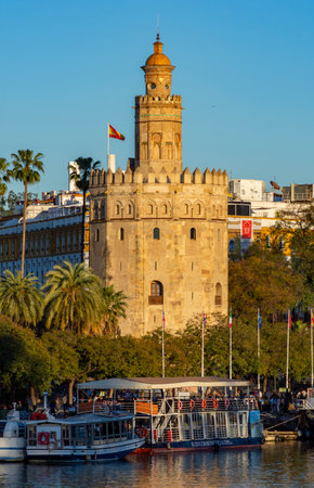 Seville, Spain - 28 March 2025: Tower of Gold (Torre del Oro) on Guadalquivir river embankment at sunset
