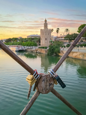 Love padlocks on Seville bridge with Golden Tower (Torre del Oro)