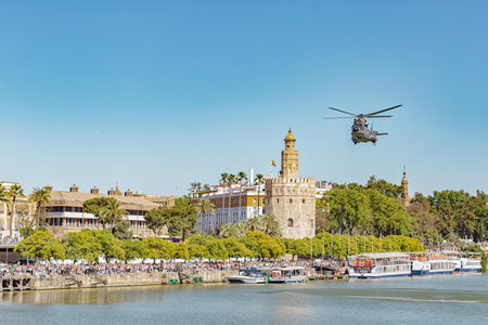 Seville, Spain - May 30, 2019: Military helicopter flying over the Guadalquivir river during display of Spanish Armed Forces Day in Seville, Spain