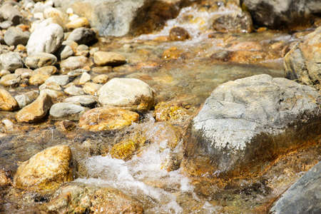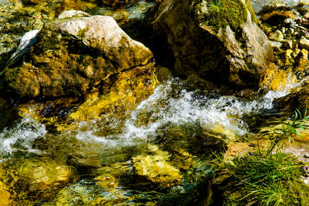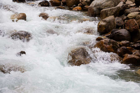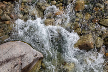 Water in the mountain raging river. Beautiful natural background of stones and water. Texture of clear water and fast river. Background to insert text.