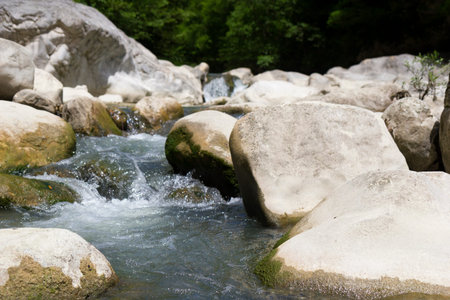 the flow of water in a clear mountain river. Environmental protection