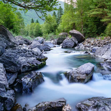 Landscape with river and forest with green trees. Silky crystal water and long exposure. Ordesa Pyrenees.