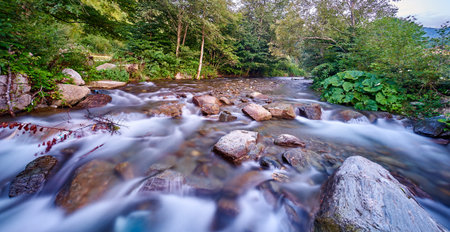 Long exposure photo of a mountain river with blurred, white water washing big boulders