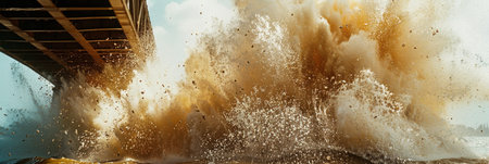 powerful rush of water cascades over a destroyed bridge, creating a dynamic and dramatic scene of natures force in action.