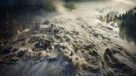 Generative AI Flood Insurance concept image. impact of climate change. City streets look like river. Consequences after heavy rainfall flooding. Destroyed houses. Aerial view