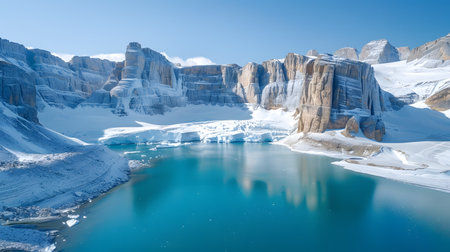 A striking landscape showcases a towering mountain range with snowy peaks and visible glacial formations. The scene is dominated by cool tones, with shades of gray, white, and blue. The composition highlights the grandeur of nature, with a focus on textures and the interplay of light and shadow, suitable for various editorial and commercial applications.