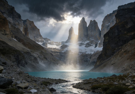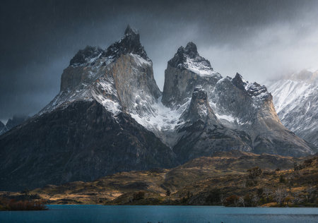 a close up of a sunlit cuernos principal on a stormy autumn day at torres del paine national park in patagonia, chile