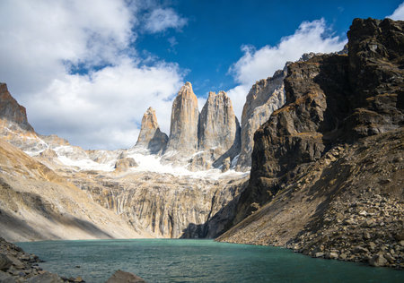 The rugged granite mountains at the Base of the Towers in Torres Del Paine National park
