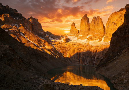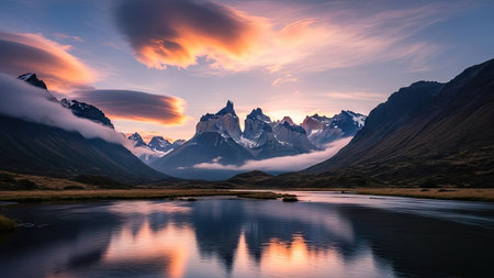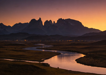 The Torres del Paine National Park sunset view. Torres del Paine is a national park encompassing mountains, glaciers, lakes, and rivers in southern Patagonia, Chile.