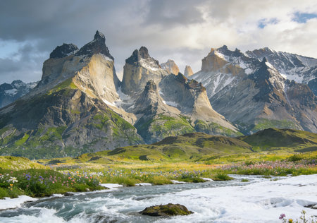 Mountain landscape with a river in the foreground, Torres del Paine National Park, Chile