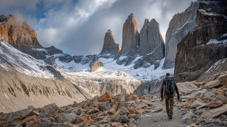 A lone hiker makes their way through the stunning landscape of Torres del Paine National Park, surrounded by rugged peaks and dramatic skies.