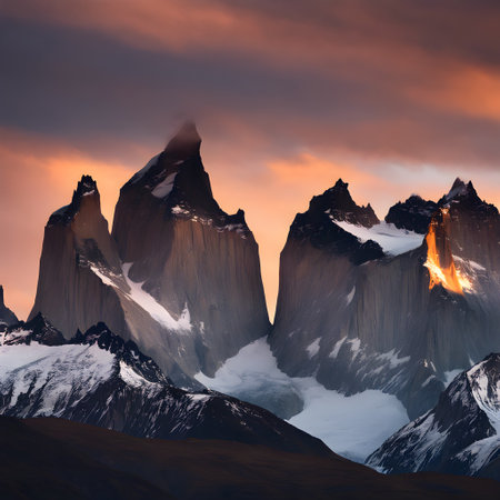 Dramatic landscape featuring snow-capped mountain peaks illuminated by golden sunlight, set against a backdrop of stormy clouds in Patagonia, creating a sense of awe and grandeur.