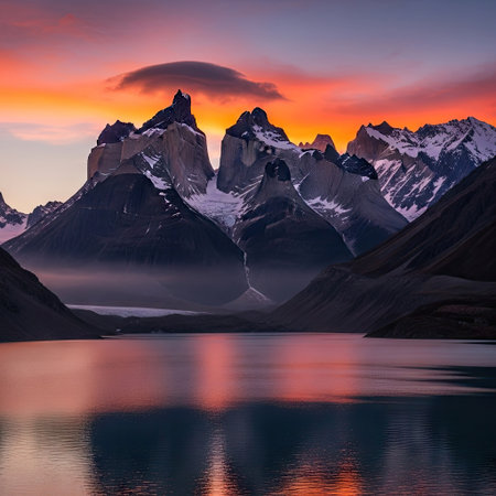 Beautiful sunset view at Lake Pehoe of the Torres Del Paine National Park. Special type of clouds (Lenticular clouds) created a wonderful red sky above the Chilean Patagonia's mountain peaks