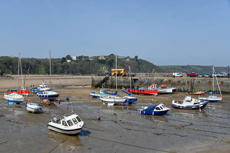 Tenby, Wales - April 15 2019 : The boats in Tenby Harbour at low tide showing the mooring lines.