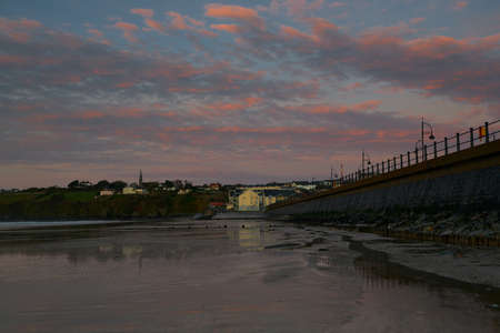 Tramore Beach, Waterford, Ireland. View of the reflections de la ciudad in the water at low tide and the long pier at sunset or sunrise hours