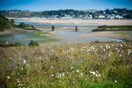 Late summer flowers at the Camel Estuary in Cornwall with the village of Rock and the abandonned railway bridge in the background. Focus on the flowers.