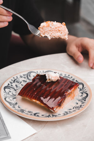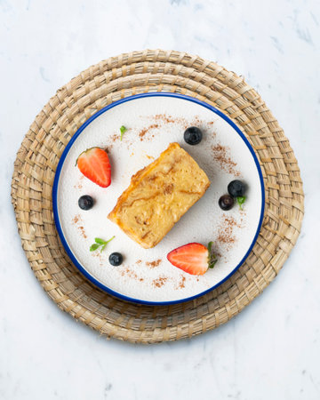 Ibizan Greixonera. Egg pudding with traditional ensaimada from the Balearic Islands. Top view table.
