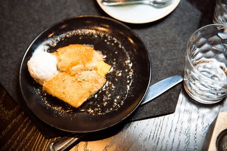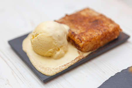 Apple pie with vanilla ice cream and caramel sauce. Appetizing sweet dessert. Culinary photography.
