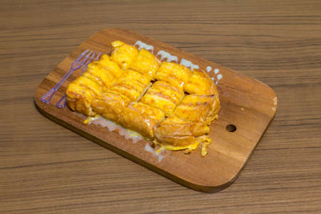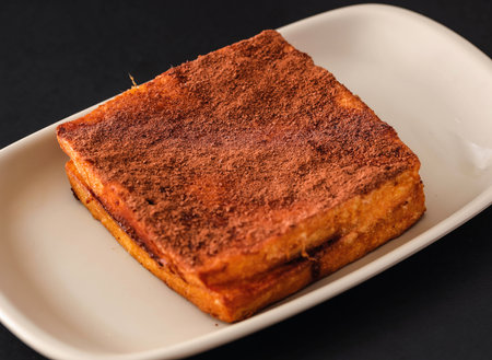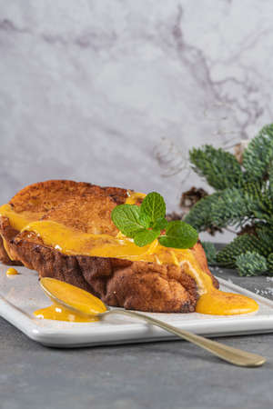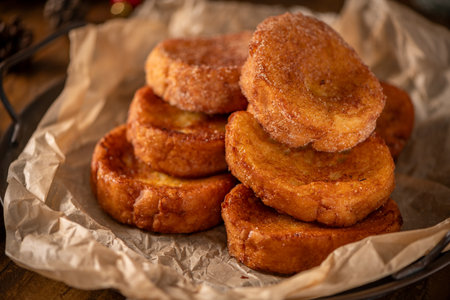 Traditional Christmas Rabanadas with egg yolk cream and cinnamon. Spanish Torrijas close up on the countertop.