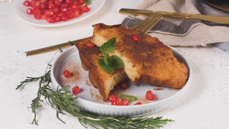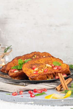 Traditional Christmas Rabanadas with lemon zest, pomegranate, pine nuts and cinnamon. Spanish Torrijas or french toasts close up on the countertop