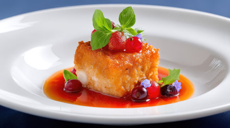 A beautifully presented dessert featuring a soft cake topped with vibrant berries and fresh herbs in a colorful sauce, ideal for fine dining experiences.