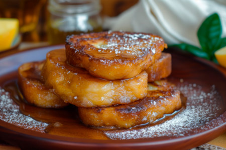 Golden brown french toast stacked high on rustic board, tasty breakfast treat