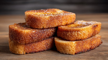 Golden Fried Bread Stack with Sugar Crystals on Wooden Surface, Sweet Treat