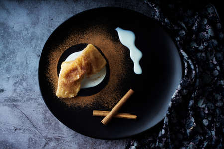 Traditional Spanish dessert of fried milk with cinnamon and decorated with condensed milk on black plate.