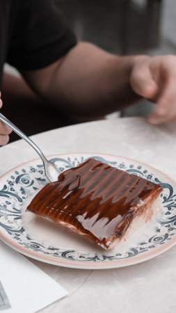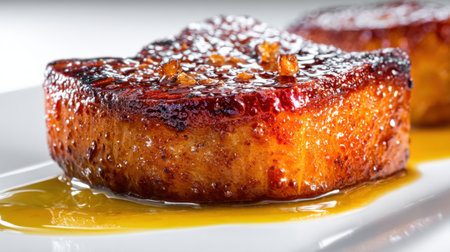 A close-up view of a caramelized sweet dessert square featuring a glossy glaze. This artistic culinary creation showcases vibrant colors and textures, perfect for gourmet presentations.