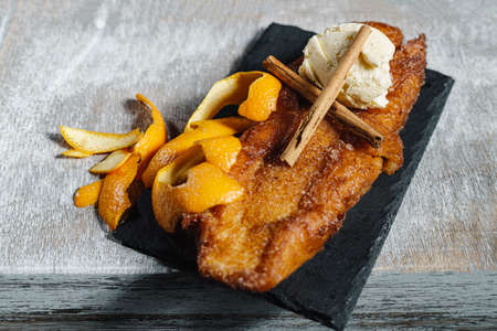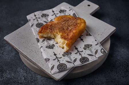 Broken piece of torrijas on craft paper on ceramic cutting board on dark background. Selective focus. Top view. Copy space