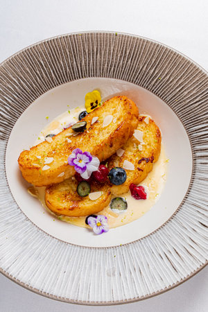 Golden French toast slices topped with vibrant berries and delicate flowers.