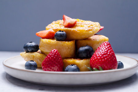 Closeup Torrijas, French Toast Made Of Sliced Brioche, Bread, Served With Orange Topping, Glaze, Fresh Blueberries, Strawberry On Plate, Granite Table. Delicious Dessert On breakfast. Horizontal plane