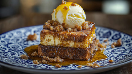 An artistic arrangement of honey toast served on a patterned plate, with a scoop of ice cream melting on top and a drizzle of honey for a delicious contrast.