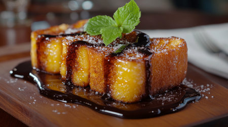 A beautifully arranged slice of toast drizzled with rich chocolate sauce and garnished with fresh mint leaves, perfect for any dessert lover.