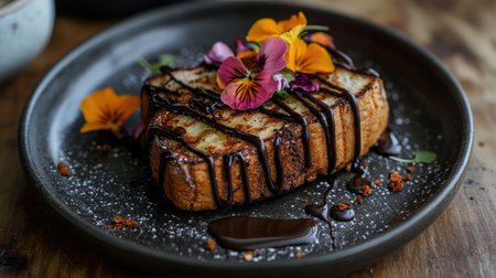 This beautiful dessert features grilled bread drizzled with rich chocolate sauce, topped with colorful edible flowers and a light dusting of powdered sugar, evoking elegance.
