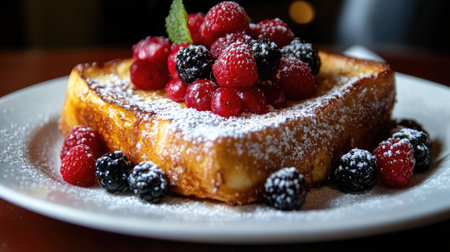 A warm piece of French toast topped with fresh berries and a dusting of powdered sugar, beautifully arranged on a white plate for an indulgent breakfast treat.