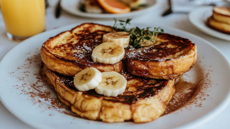 Enjoy a cheerful breakfast scene featuring a stack of French toast topped with banana slices, served with a refreshing drink and vibrant atmosphere.