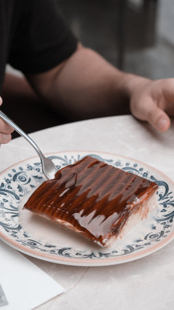 A stylish dessert setting showcasing a slice of honey toast with chocolate drizzle and edible flowers, elegantly plated for a sophisticated dessert experience.