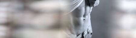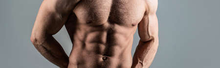 Banner with nude man bare torso on black isolated. Cropped body of sexy muscular naked gay. Bare abs guy.