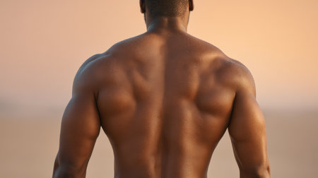A strong athletic man stands with his back toward the camera at sunset, highlighting his muscular build and representing themes of strength and wellness in nature.