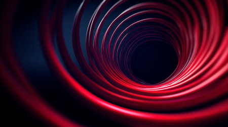 Red circular spiral objects are viewed in close and lit with fluorescent colors against a deep blue background.