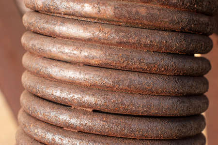 Industrial details, mechanical objects and tools concept. Spring on steel big machinery closeup