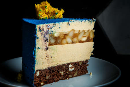 closeup piece of blue mousse cake with yellow sponge cake decoration on top and caramel pear inter layer stands on white plate on black background