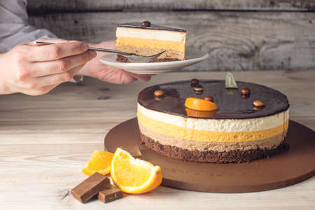 Woman holding a piece of Orange chocolate cake with layers of delicate souffle, a Delicious homemade dessert