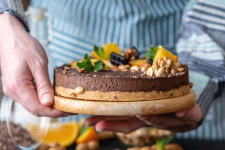 Hands decorated with chocolate cake orange and mint leaves with peanuts and nuts. Concept healthy raw gluten-free and milk-and flour-free desserts for vegan food