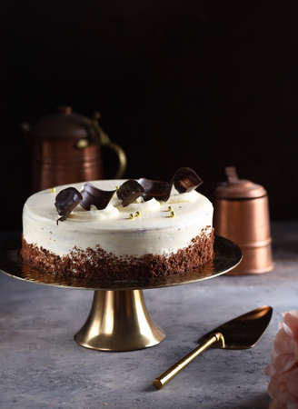 Luxury chocolate cake-cake decorated with a golden decor of caramelized popcorn on a dark background. Flat lay. Close-up. Copy space.