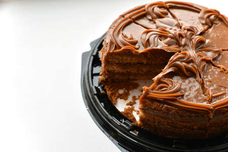 Chocolate cake caramel with cherry and fruit on white plate / Close up cake slice