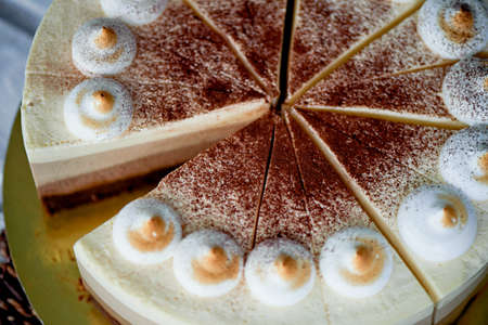Lovely cake , decorated with chocolate and small meringues. The view from the top.A work of culinary art
