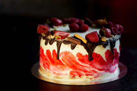 Sweet cake with chocolate drops and fresh fruit Strawberry